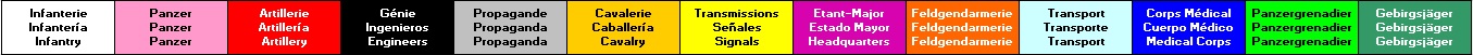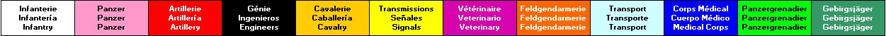 Blanco: Infantería // Rosa: Panzer // Rojo: Artillería // Negro: Ingenieros // Amarillo dorado: Caballería // Amarillo limón: Señales // Carmín: Veterinario // Naranja: Feldgendarmería // Azul oscuro: Cuerpo Médico // Verde claro: PanzerGrenadier // Verde medio : Gebirgsjäger